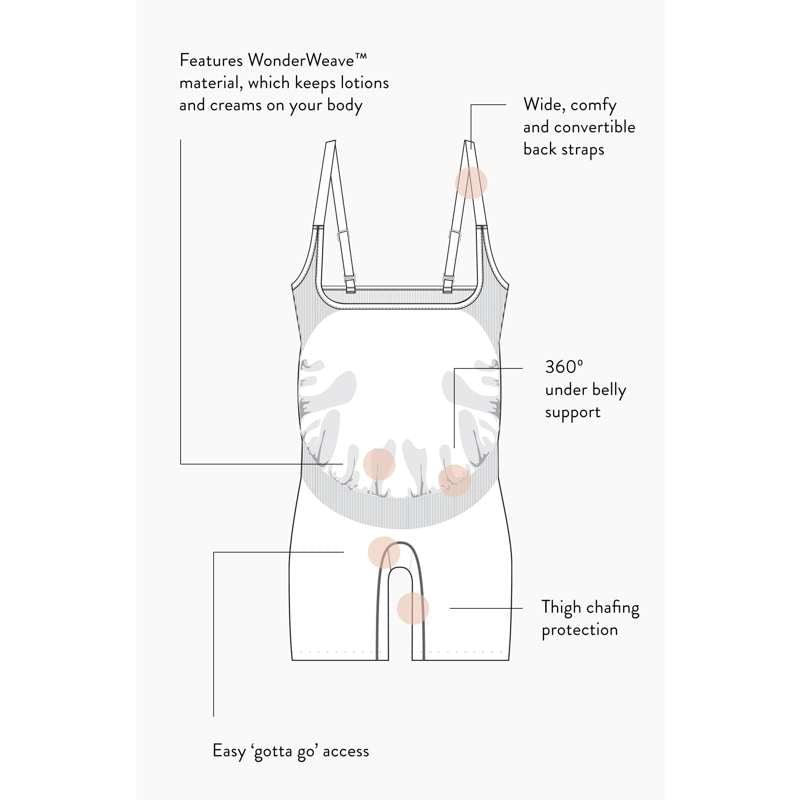 Bump Support Bodysuit giver kraftfuld, vokse-med-dig mave- og rygstøtte og passer komfortabelt til dine yndlings-bh'er og svingende bryststørrelse. Det innovative design er det første af sin slags og yder væsentlig lodret støtte. Det åndbare materiale hjælper med at forhindre lårskaf og udglatter dine lår, stød og ryg.