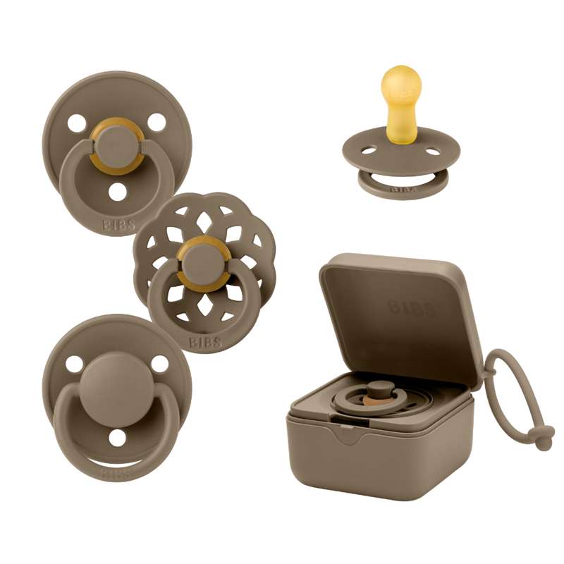 Denne bundle består af 3 stk. BIBS sutter i str. 2. Alle sutterne har et rundt suttehoved i naturgummi. Ligeledes medfølger en sutteboks med plads til de tre sutter.