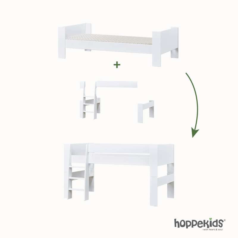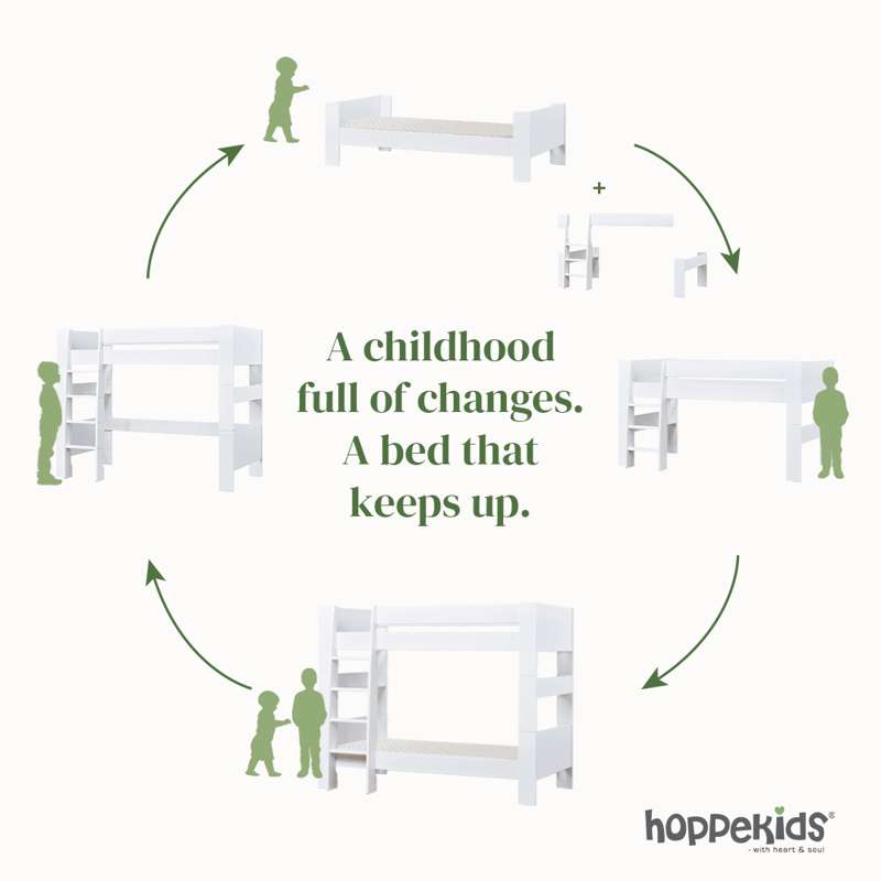 Hoppekids PURE halvhøj seng er en del af et sengesystem, hvilket betyder, at sengen kan bygges om til en anden sengetype. Den halvhøje seng består af en juniorseng og et modul. Du kan derfor fjerne modulet og bruge sengen som en juniorseng i stedet for. Ved tilkøb af moduler, kan sengen også bygges om til en højseng (med modul artikelnummer: 31-6180-82-09A) og en køjeseng (med modul artikelnummer: 31-6151-82-09A).