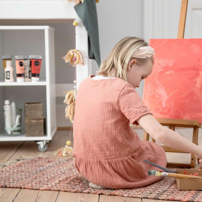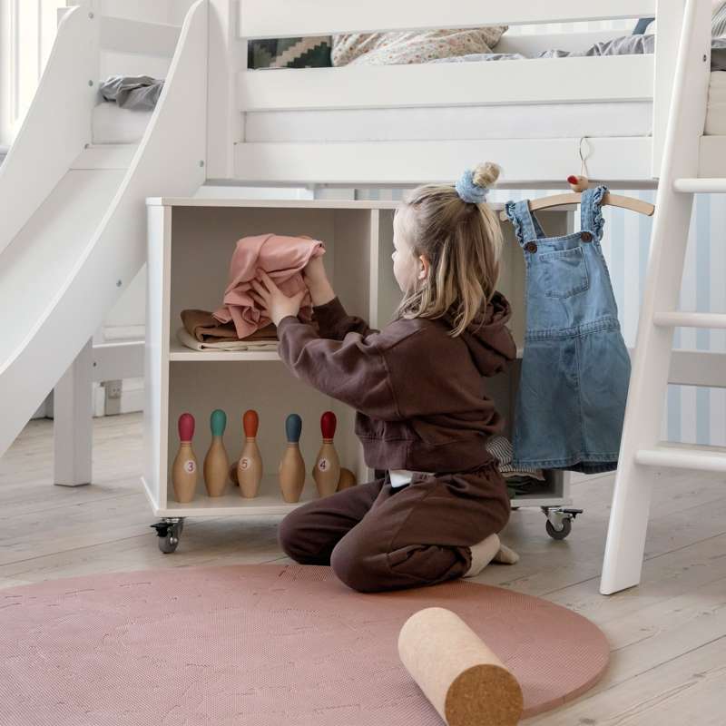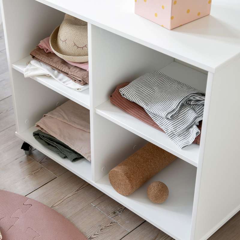Højden på reolen gør, at den er ideel til at indrette som dukkehus og toppen kan bruges som legeoverflade til, når der bygges med klodser eller andet. Hjulene gør det nemt at flytte reolen rundt i værelset og det giver en rigtig fin fleksibilitet. Det er derfor nemt at flytte rumdeleren når der skal gøres rent, leges eller når værelset trænger til lidt forandring.