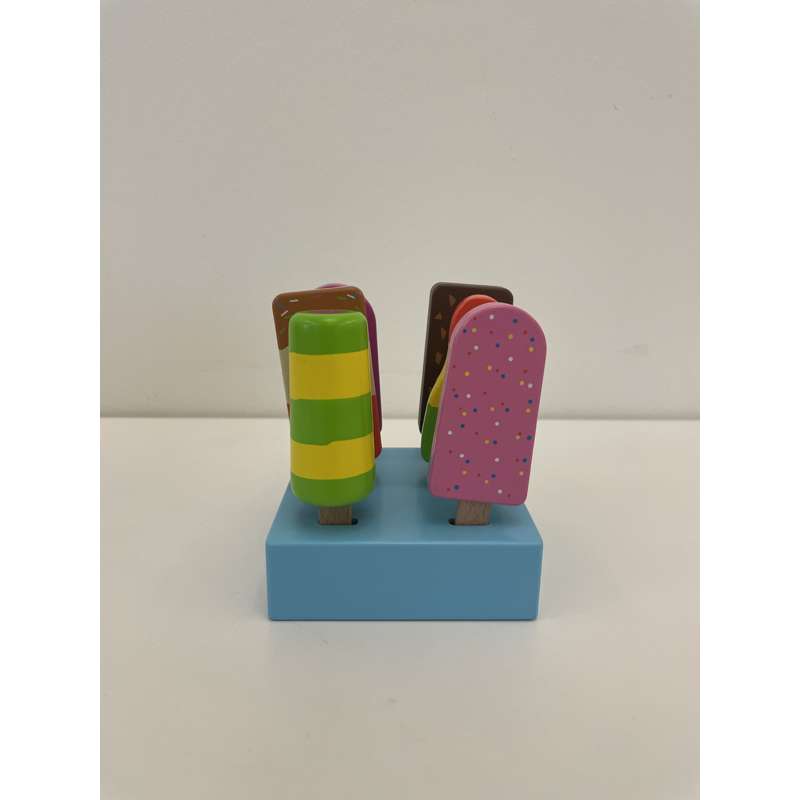 Sættet består af 6 ispinde inkl. en fin stander til opbevaring. Alt er lavet i træ.