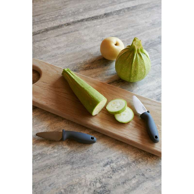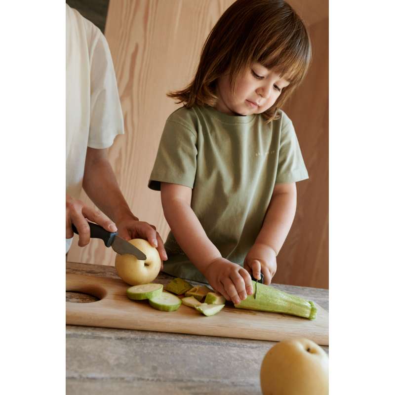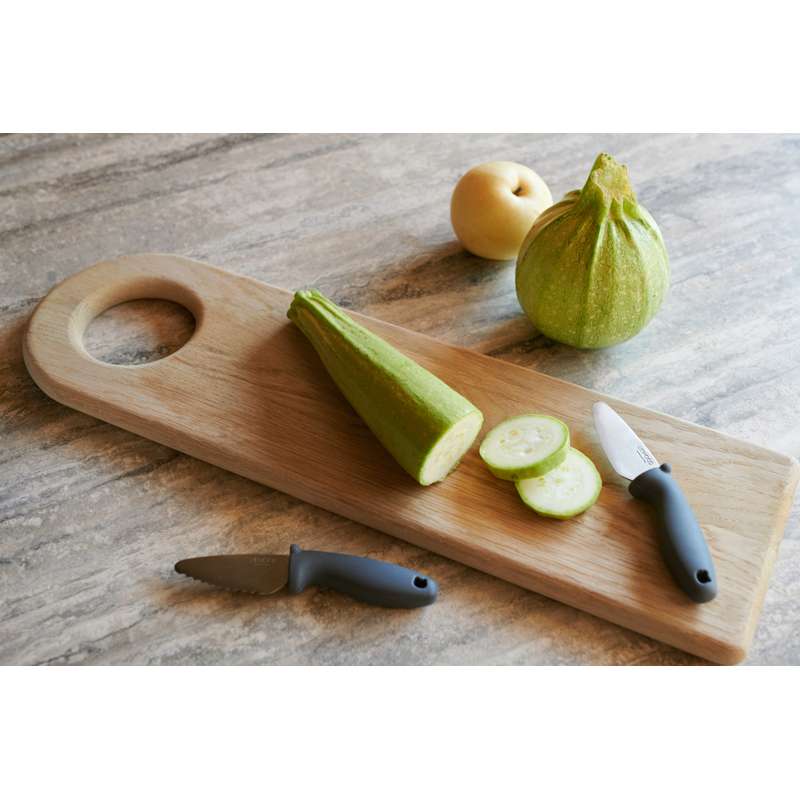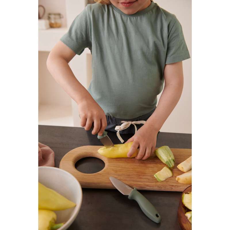 Med de fine kokkeknive, der kommer i sæt af 2, kan børnene være med i køkkenet på (næsten) lige fod med mor og far. Knivene er designet så skæret nemt kan gå gennem frugt og grønt - men ikke igennem børnefingre.