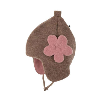 Pande- og øreområdet er godt dækket, og to bindebånd forhindrer, at huen falder af. En løkke på spidsen og en sød, tredimensionel blomsterapplikation giver det sidste lille ekstra til designet.