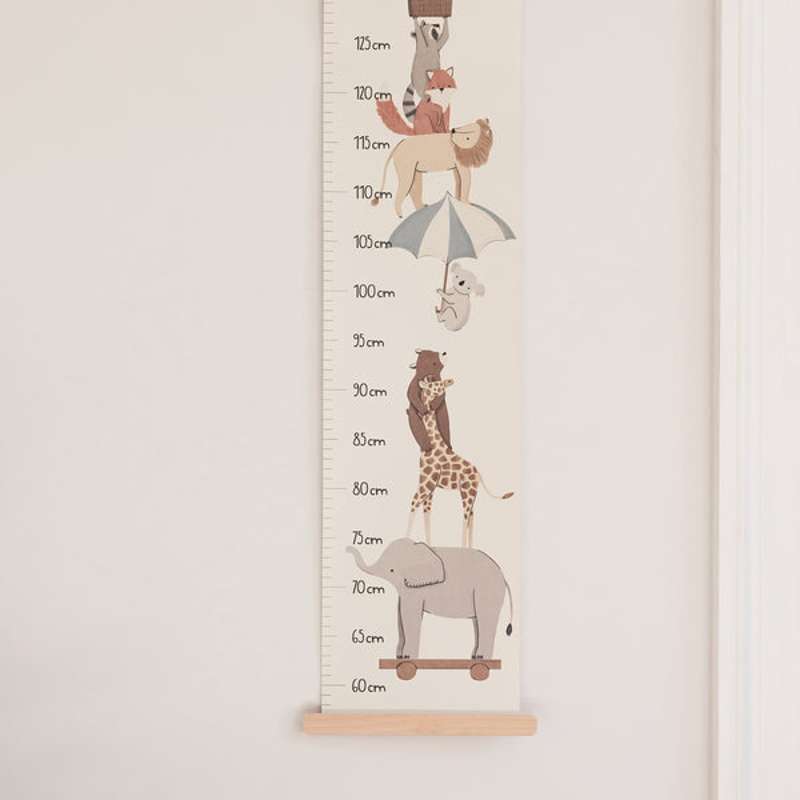 Den 125 cm lange højdemåler er dekoreret med dyrene fra World of Sebra-temaet, og fremstillet i kraftigt 250 grams papir. Den er monteret mellem to træholdere og kræver ikke mere end et lille søm eller en skrue for at blive hængt op.