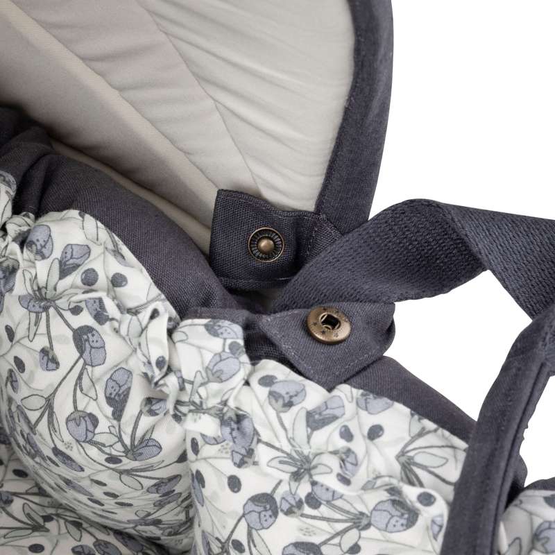 Kalechen placeres nemt i den ene ende af babynesten og fastgøres sikkert omkring hankene med en tryklås, så den altid sidder stabilt.