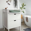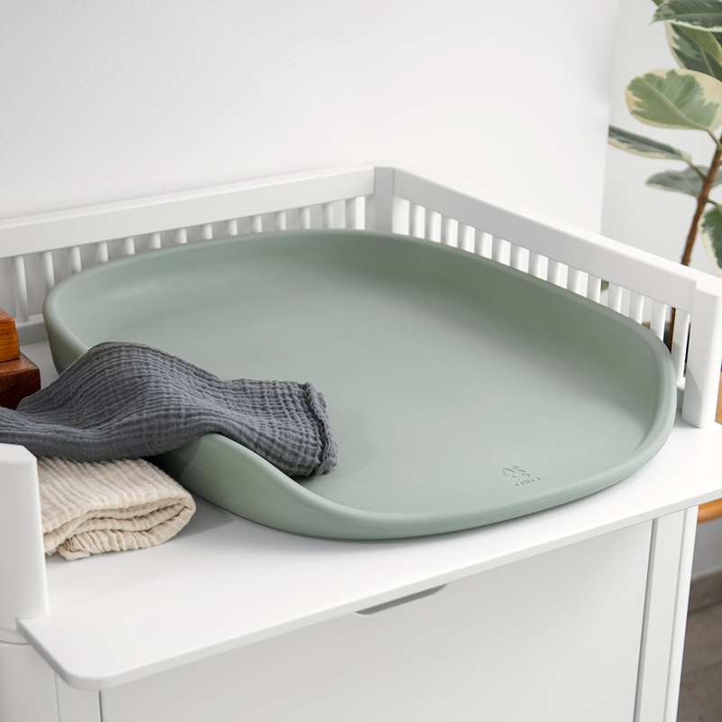 Den bløde kant sikrer samtidig, at det aktive barn, som er i bevægelse under bleskiftet, ikke slår hovedet imod en hård bagvæg eller puslebordets kant.