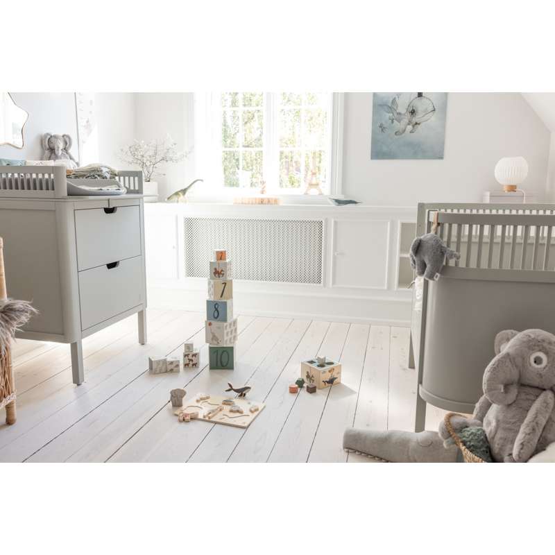 Sebra Sengen – sengen, der vokser med barnet sammen med det populære Sebra puslebord m. Skuffer - begge i farven Stone Grey. Samt en nuance-matchende uroholder i farven Elephant Grey.