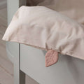 Sengetøjet indeholder dynebetræk og hovedpudebetræk i babystørrelse. Begge dele har en god YKK-lynlås, der er skjult, så den ikke generer søvnen. Som en ekstra detalje har dynebetrækket et lille blad påsyet, der fungerer som nulreflap til små søvnige fingre.